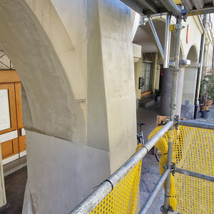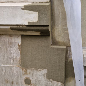 Restaurierung einer Sandsteinfassade in Thun ersetzen von verwitterten Sandsteinelementen. Kleinere Flickstellen wurden mit Trassmörtel (Ergänzungsmörtel für Sandstein) aufgemörtelt.